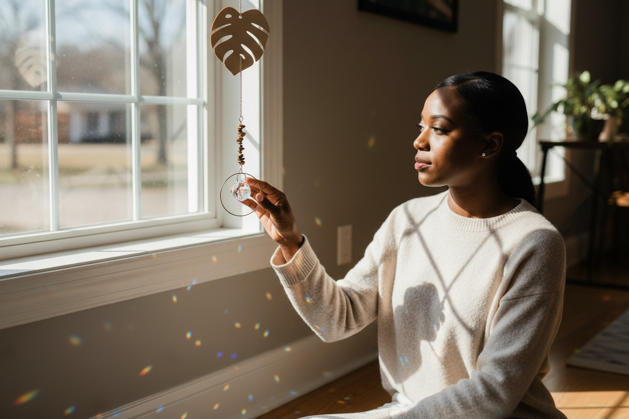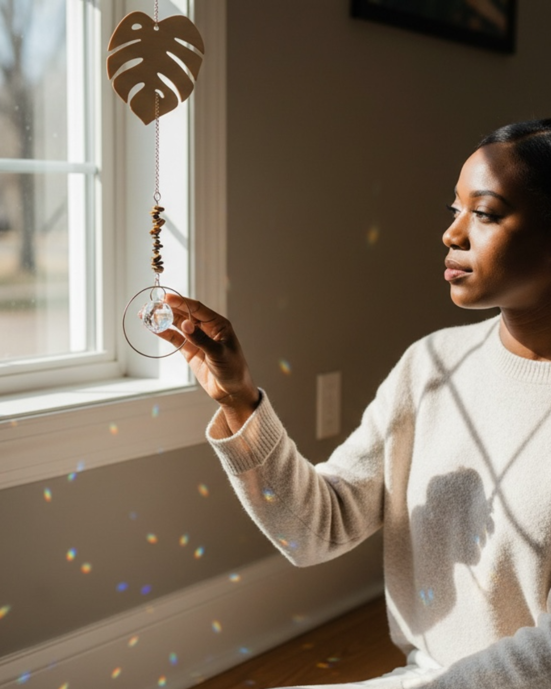 Bring botanical magic to your windows with this enchanting Monstera Suncatcher. Featuring the iconic split-leaf design adorned with shimmering gemstones and sparkling accents, it catches sunlight to cast dancing rainbows across your space. Perfect for plant lovers and light-play enthusiasts alike, this whimsical piece transforms any room into a garden of glittering wonder. Hang it proudly and watch it sparkle!