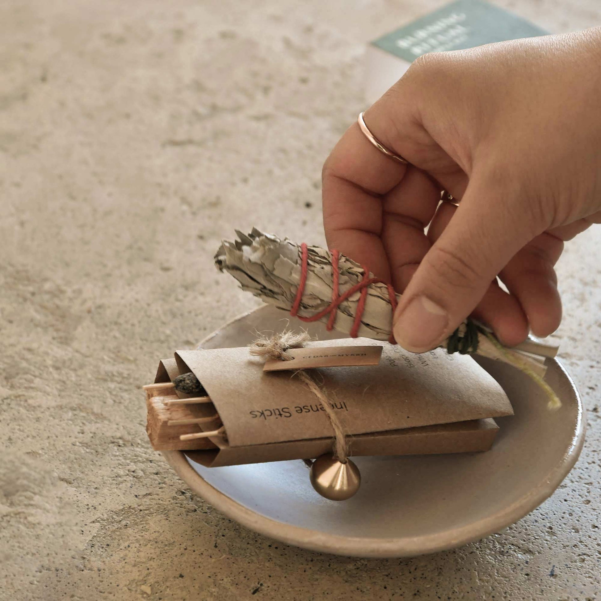 - Includes: mini white sage bundle, 2 Palo Santo sticks, 5 mini hand-rolled incense sticks, and a brass incense holder